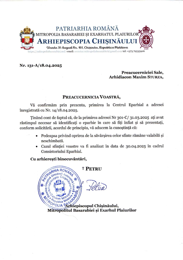Mitropolia Basarabiei subliniază că pe numele lui Maxim Sturza fusese declanșată o cercetare canonică în cadrul Consistoriului Eparhial, în timpul căreia orice activitate liturgică îi era interzisă, inclusiv în afara eparhiei. Orice „transfer” canonic sau înfiere într-o altă eparhie era posibil doar cu acordul scris al unei alte structuri canonice din Patriarhia Română și doar până la data de 18 aprilie – termen ignorat de fostul diacon, susține Arhiepiscopia.