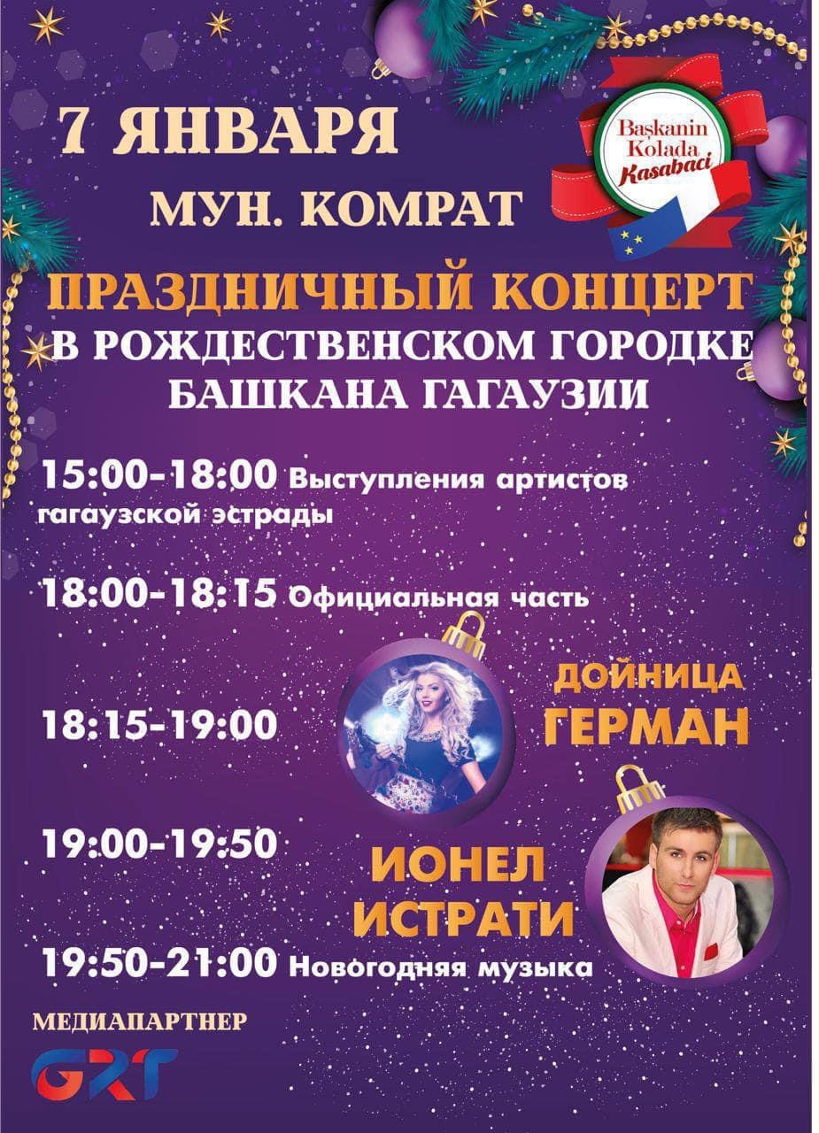 La ora 18:00 va fi dat startul programului oficial, iar ulterior pe scenă vor urca interpreții Doinița Gherman și Ionel Istratii. Vă așteptăm cu drag să sărbătorim Crăciunul împreună!”, se arată într-un comunicat de presă.