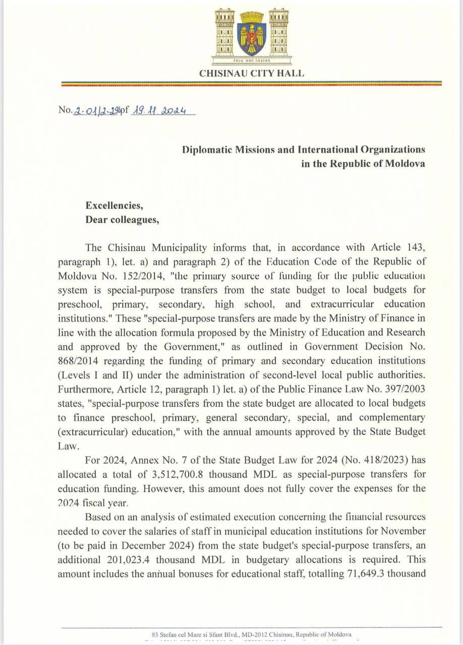 Scandalul dintre Primăria Chișinău și Ministerul Educației continuă. Primarul general al capitalei, Ion Ceban, a sesizat misiunile diplomatice privind situația din sistemul educațional municipal, publicând mai multe documente care demonstrează faptul că autoritățile centrale ar fi creat artificial această problemă.