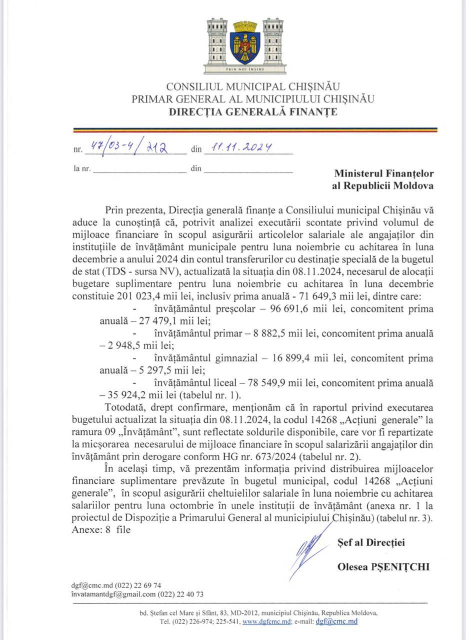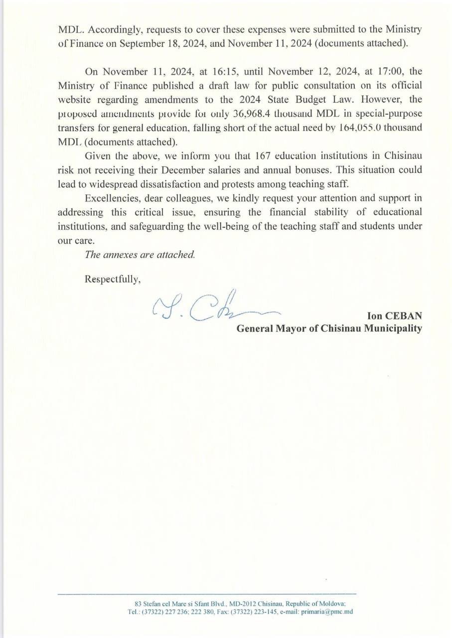 Primarul general capitalei, Ion Ceban, a afirmat, la 19 noiembrie curent, că profesorii din instituțiile de învățământ din capitală ar putea rămâne fără salarii în luna decembrie. Acesta a estimat că, pentru sfârșit de an, ar fi prevăzuți din bugetul de stat 36 de milioane de lei, în loc de circa 200 de milioane.
