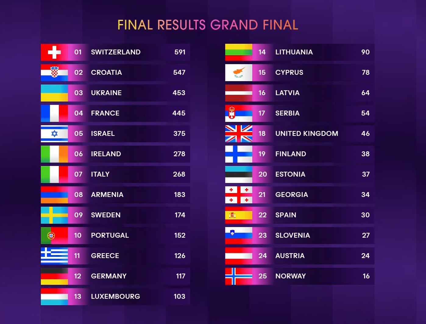 Eurovision Song Contest 2024 a fost câștigat de Elveția. Interpretul Nemo a făcut show cu piesa „The Code” și a câștigat marele trofeu din 2024. În urma voturilor, interpretul a acumulat 591 de puncte, 365 de puncte fiind din partea juriului, iar 226 de puncte i-a oferit publicul.