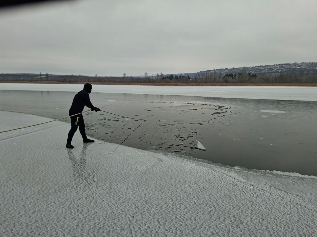 (FOTO) Autoturism prăbușit sub gheață pe lacul Ghidighici. Scafandrii IGSU au intervenit de urgență