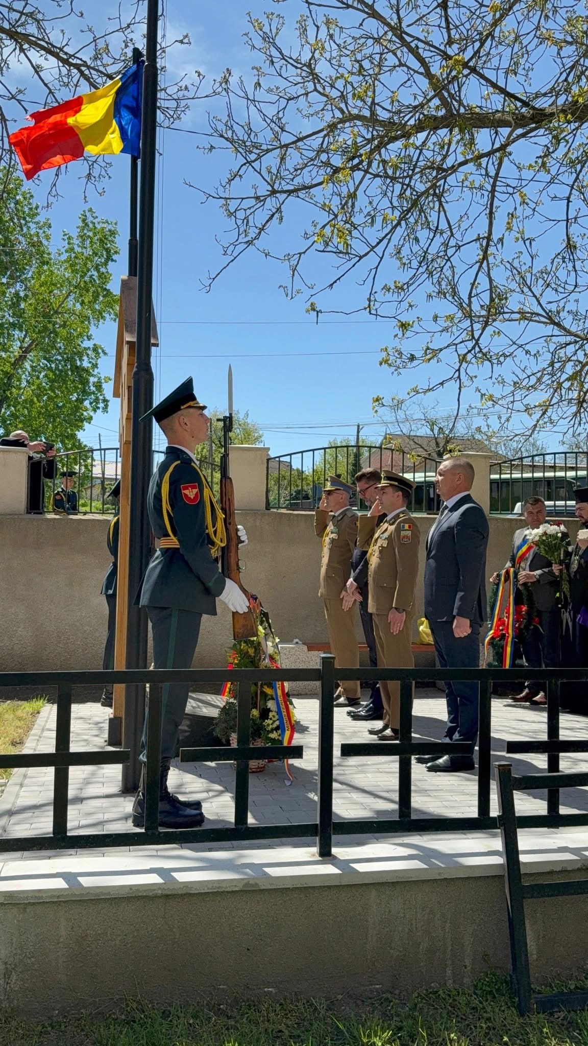 Ceremonialul s-a desfășurat în curtea bisericii din sat, în ziua în care românii de pretutindeni marchează Ziua Veteranilor de Război.