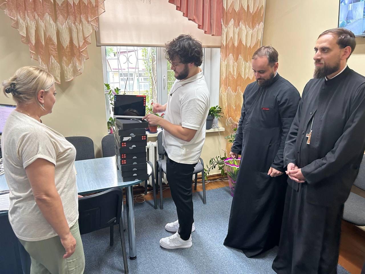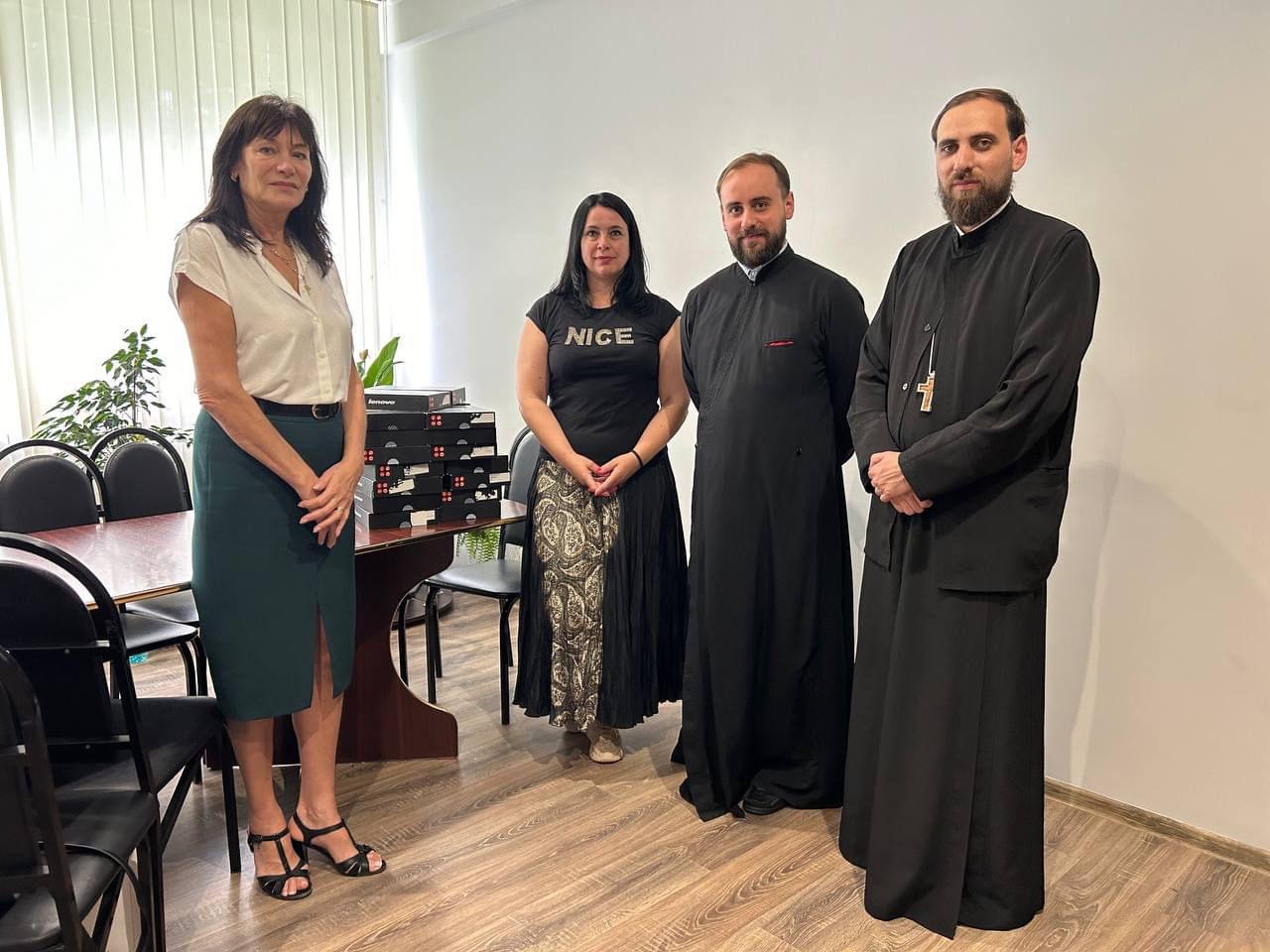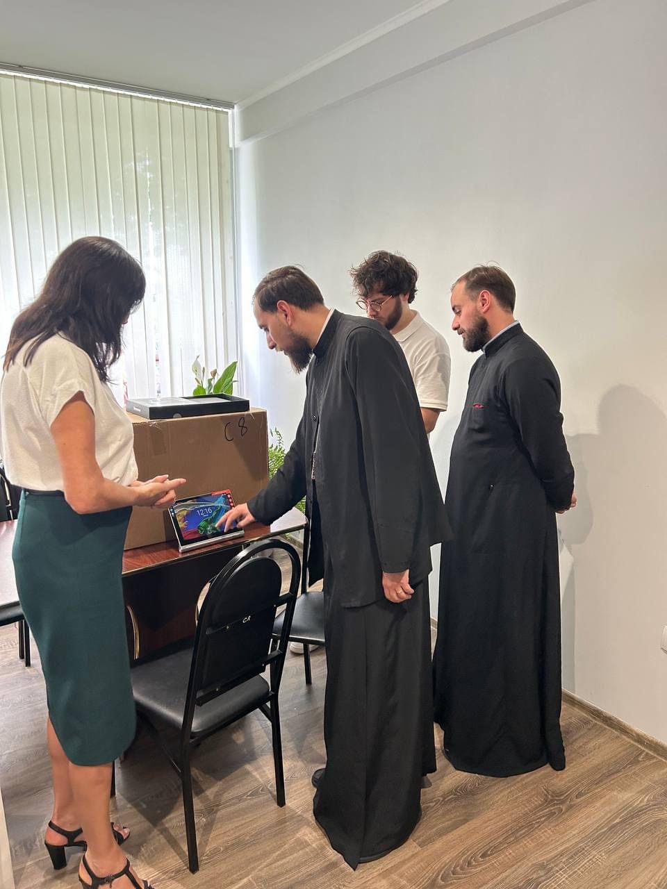 Prima oprire a fost la IP Liceul Teoretic „Hyperion”, unde au fost donate 30 de tablete digitale. Doamna director, Tamara Pasat, a exprimat profunda recunoștință Mitropoliei Basarabiei pentru generoasa donație, subliniind cât de important este acest sprijin pentru elevi și pentru calitatea actului educațional