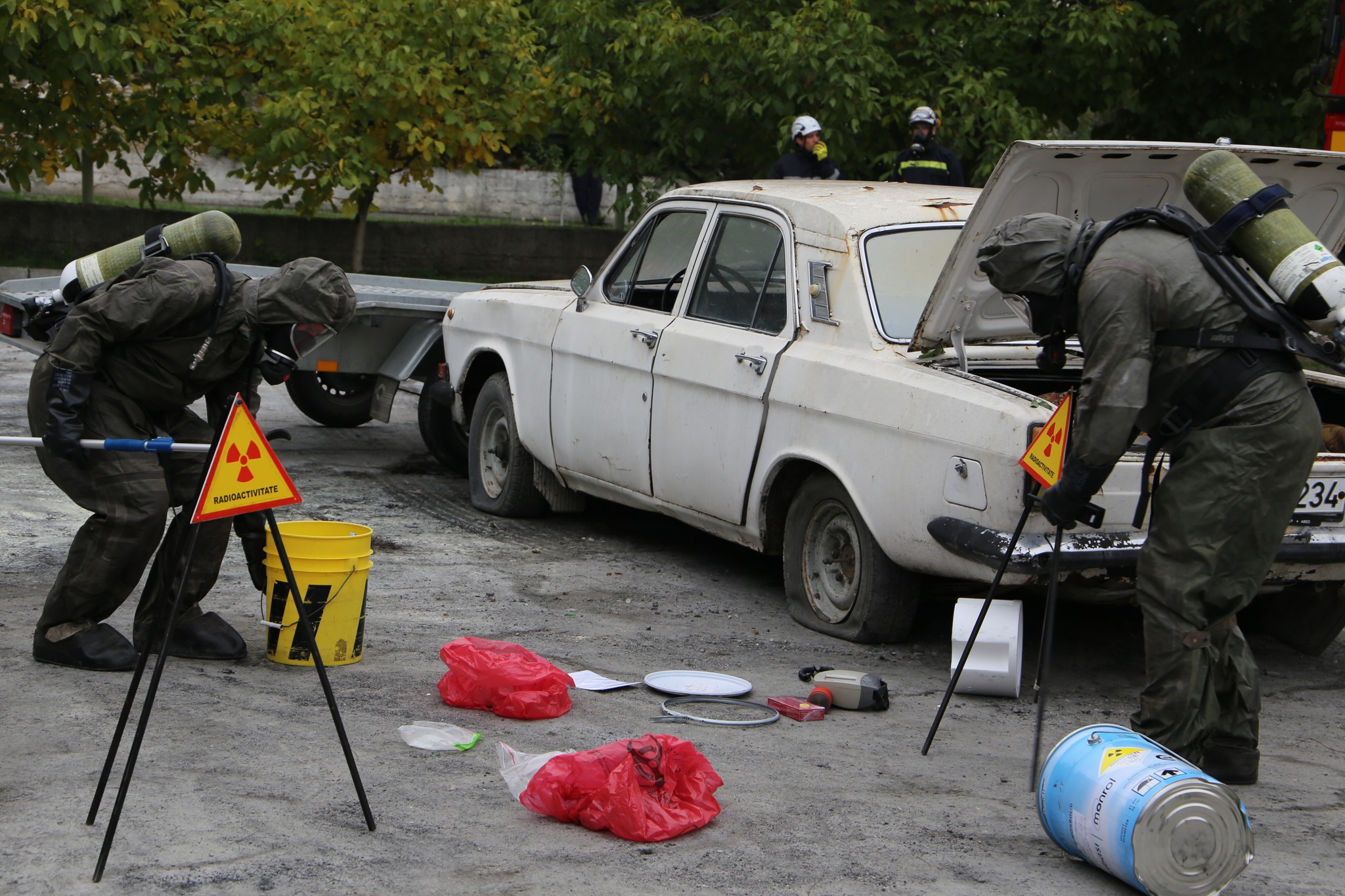 În urma impactului, substanțe radioactive au fost răspândite în mediu, iar în al doilea automobil au rămas două persoane încarcerate. Salvatorii au demonstrat modul de decontaminare a autospecialelor și deblocarea persoanelor sinistrate în urma lucrărilor de descarcerare. Sinistrații extrași din autovehiculul contaminat au trecut prin procesul de decontaminare pentru a evita riscul pentru sănătate.