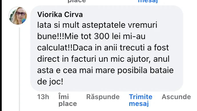Un exemplu este o familie cu doi copii mici, care a primit 310 lei compensație, deși factura la gaz a ajuns la 1.800 de lei. O altă familie, formată din trei persoane, dintre care două cu dizabilități, a scris că a primit 300 de lei drept compensație. Într-o situație similară, o familie cu trei copii, unul având dizabilitate severă, se întreabă cum să gestioneze facturile de mii de lei dintr-un venit lunar de 11.000 de lei, în condițiile în care compensația este de doar 300 de lei.