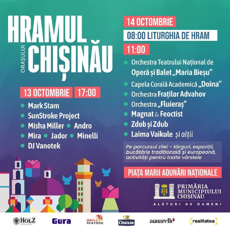 În acest an, Hramul Orașului Chișinău va fi sărbătorit timp de două zile: pe 13 și 14 octombrie. Potrivit Primăriei Municipiului Chișinău, sărbătoarea este prevăzută pentru două zile pline de activități, care reflectă bogăția culturală și diversitatea orașului.