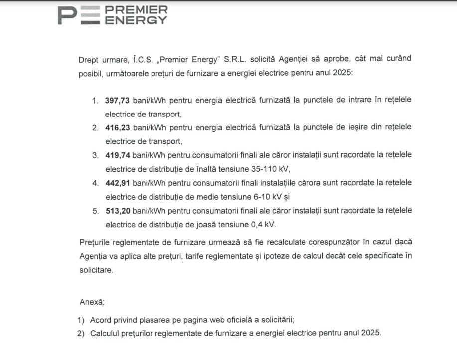 Premier Energy solicită un tarif de 4,19 lei/kWh pentru consumatorii finali ale căror instalații sunt racordate la rețelele electrice de distribuție de înaltă tensiune; 4,42 lei/kWh – pentru consumatorii finali ale căror instalații sunt racordate la rețelele electrice de distribuție de medie tensiune; 5,13 lei/kWh – pentru consumatorii finali cu instalații racordate la rețelele electrice de distribuție de joasă tensiune.