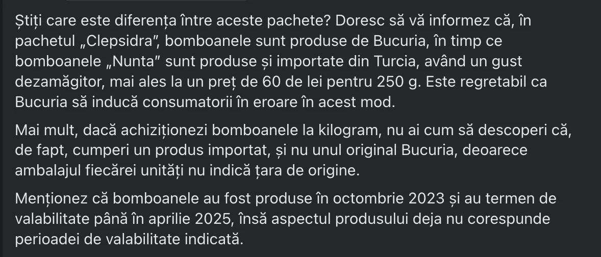 Reacția conducerii companiei vine după ce o moldoveancă a criticat public, pe rețelele sociale, diferențele dintre bomboanele „Clepsidra”, produse în Moldova, și cele din gama „Nunta”, fabricate în Turcia.