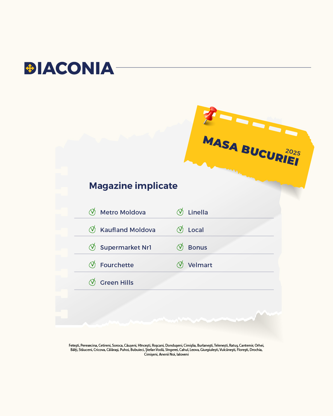 Diaconia îndeamnă toți doritorii de a sprijini proiectul să facă o donație de produse alimentare neperisabile în rețelele de magazine din Chișinău: Metro, Kaufland, Nr1, Linella, Local, Bonus, Green Hills, Velmart, cât și în alte 33 localități (Edineț, Peresecina, Ungheni, Soroca, Căușeni, Hîncești, Strășeni, Dondușeni, Cimișlia, Edineț, Telenești, Măgdăcești, Cantemir, Orhei, Bălți, Stăuceni, Cricova, Călărași, Chetrosu, Bubuieci, Ștefan Vodă, Sîngerei, Cahul, Leova, Giurgiulești, Vulcănești, Florești, Drochia, Colonița, Tohatin, Anenii Noi, Rîșcani, Cărpineni).