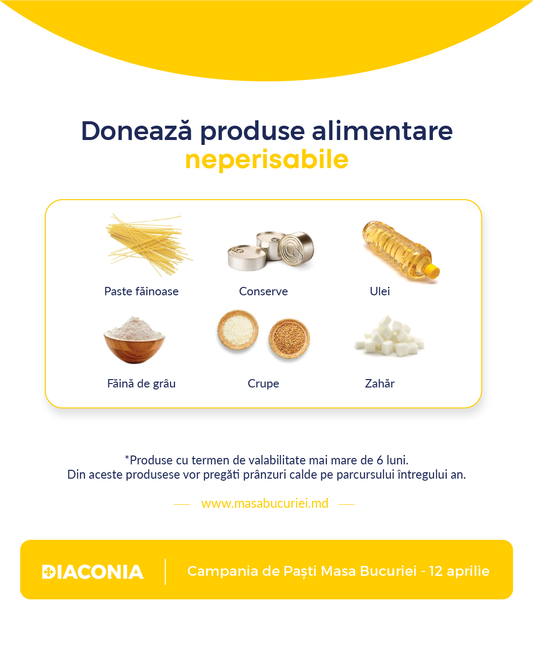 Diaconia recomandă să donați produse alimentare neperisabile și cu termen de valabilitate mai mare: crupe, ulei, paste, zahăr, sare, conserve, întrucât acestea vor fi distribuite către beneficiari pe parcursul întregului an.