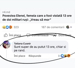 Femeia, educatoare la grădinița de copii „Guguță” din orașul Telenești a comentat pe Facebook un articol despre o femeie care ar fi fost violată timp de 13 ore de doi militari ruși, lăudând „performanța” soldaților. Mai mult, pe pagina sa din rețelele sociale, aceasta distribuia diferite texte și video-uri cu mesaje și dezinformări din arsenalul propagandei pro-Kremlin: că războiul a fost provocat de ucraineni, că americanii și NATO stau în spatele agresiunii militare etc.