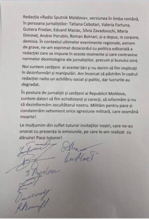 Opt jurnaliști au semnat o declarație publică prin care și-au anunțat plecarea de la postul rusesc, unul dintre principalele vehicule ale propagandei ruse în Republica Moldova.
