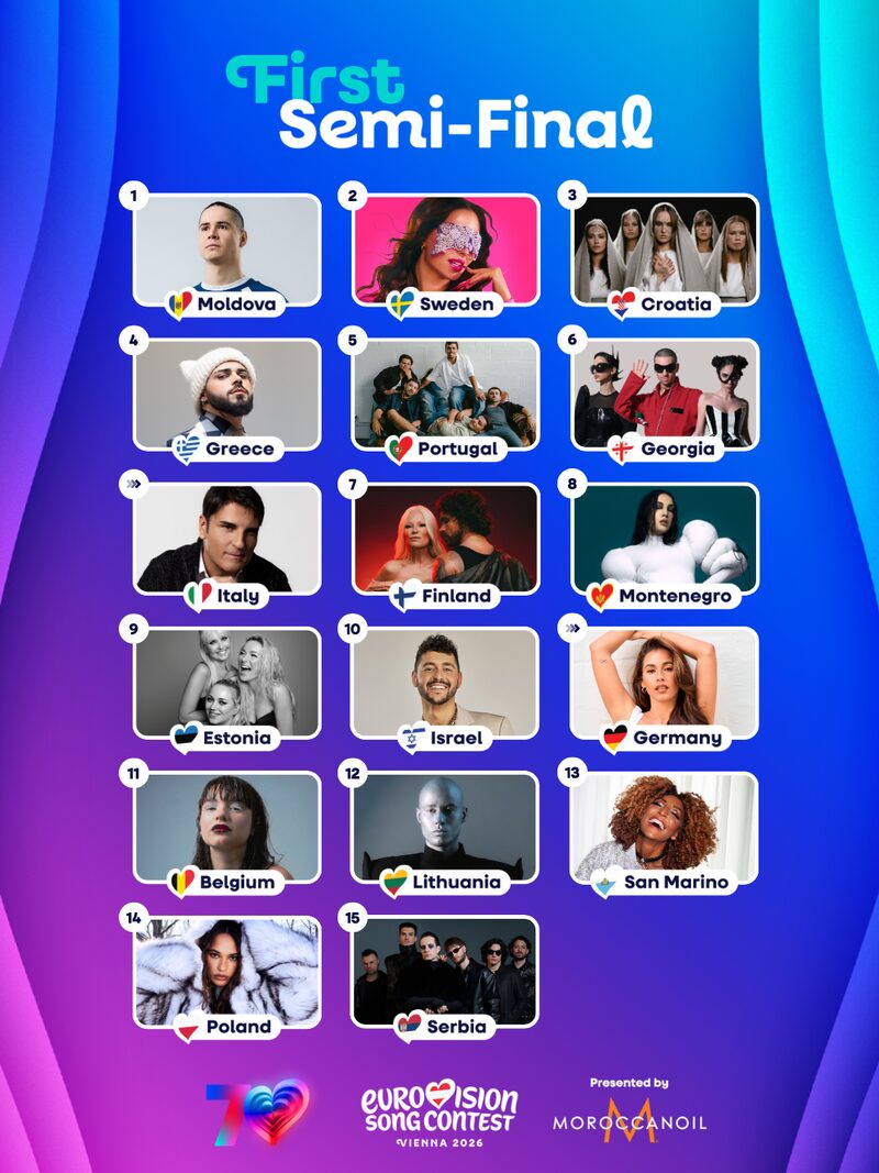 După evoluția Republicii Moldova, în prima semifinală vor urma reprezentanții din Suedia, Croația, Grecia, Portugalia, Georgia, Italia, Finlanda, Muntenegru, Estonia, Israel, Germania, Belgia, Lituania, San Marino, Polonia și Serbia.