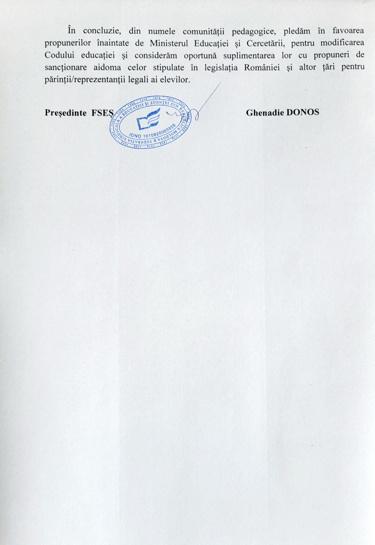 În concluzie, din numele comunității pedagogice, pledăm în favoarea propunerilor înaintate de Ministerul Educației și Cercetării, pentru modificarea Codului educației și considerăm oportună suplimentarea lor cu propuneri de sancționare aidoma celor stipulate în legislația României și altor țări pentru părinții/reprezentanții legali ai elevilor”, se arată în scrisoarea Federației Sindicale a Educației și Științei.
