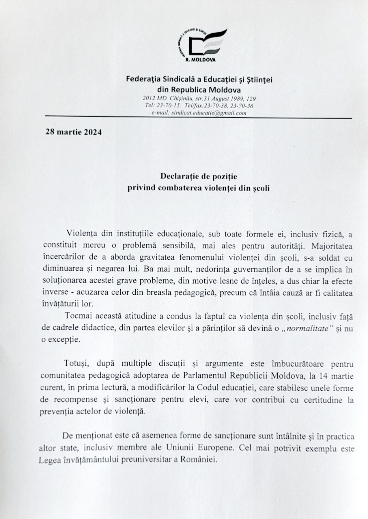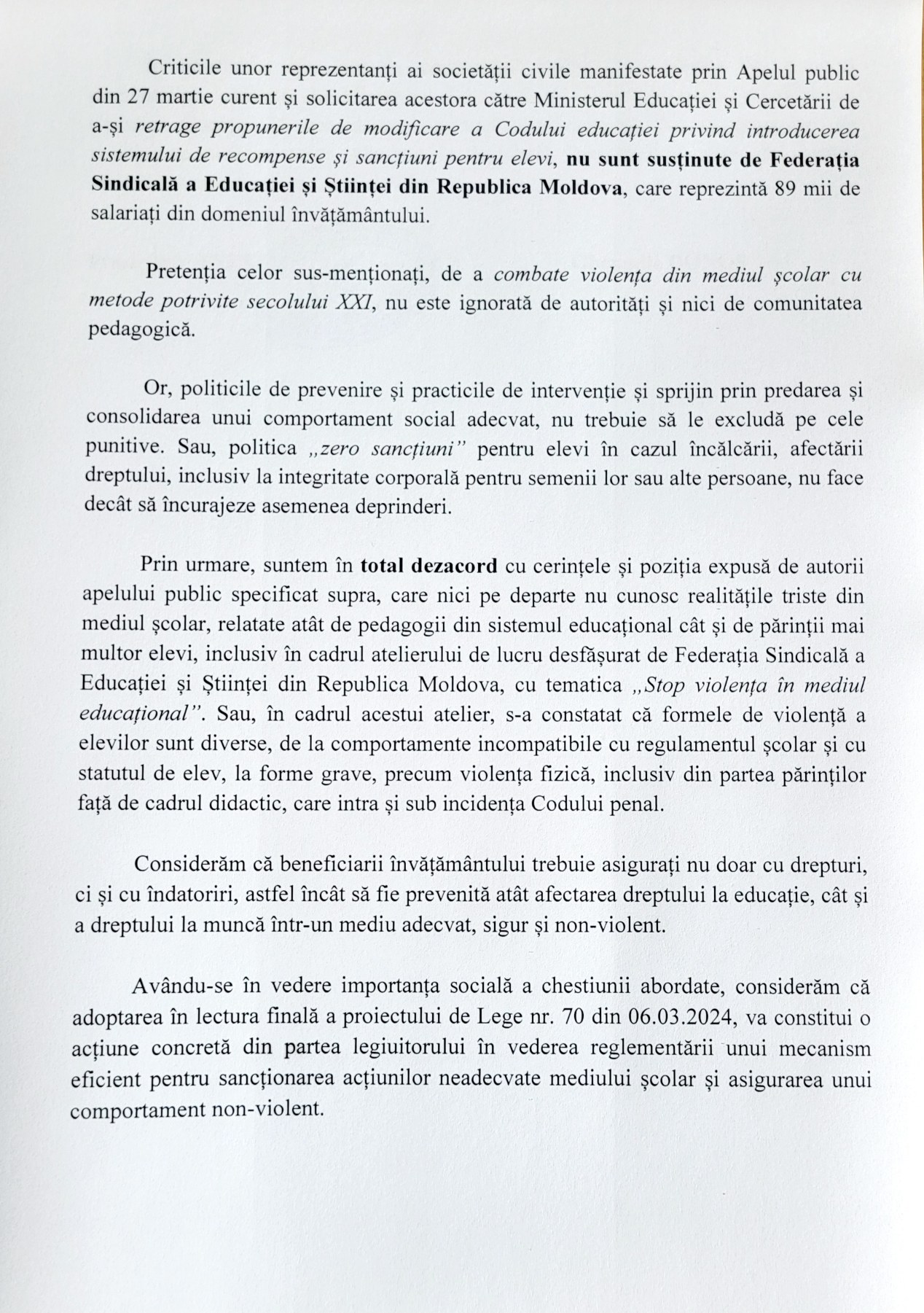 „Avându-se în vedere importanța socială a chestiunii abordate, considerăm că adoptarea în lectura finală a proiectului de Lege nr. 70 din 06.03.2024, va constitui o acțiune concretă din partea legiuitorului în vederea reglementării unui mecanism eficient pentru sancționarea acțiunilor neadecvate mediului școlar și asigurarea unui comportament non-violent.