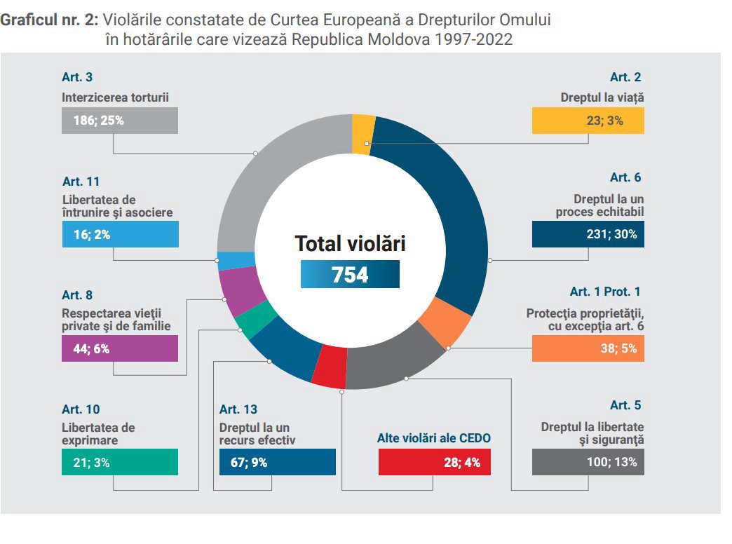 Cele mai frecvente tipuri de violări constatate de CtEDO în cauzele moldovenești sunt neexecutarea hotărârilor judecătorești, maltratarea, anchetarea inadecvată a maltratărilor şi deceselor, detenția în condiții proaste, detenția ilegală și casarea neregulamentară a hotărârilor judecătorești irevocabile. În baza tuturor hotărârilor şi deciziilor pronunțate până la 31 decembrie 2022, Republica Moldova a fost obligată să plătească 22,4 milioane de euro, dintre care, doar în 2022 – peste 544 de mii de euro.