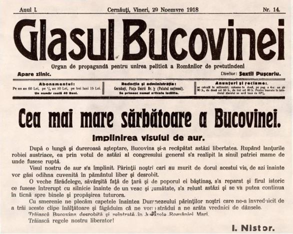 Pe 28 noiembrie 1918, reprezentanţii Bucovinei au proclamat Unirea cu țara. În 1918, Congresul General al Bucovinei adopta, la Cernăuţi, moţiunea unirii Bucovinei cu Regatul României. România îi datorează boierului Iancu Flondor faptul că Suceava şi mănăstirile lui Ştefan cel Mare se află astăzi pe teritoriul său. Îi datorează mult şi profesorului Sextil Puşcariu, jurnalistului Valeriu Branişte, ofiţerului Ilie Lazăr şi medicului Isidor Bodea. Ei au fost liderii mișcării patriotice din Bucovina.