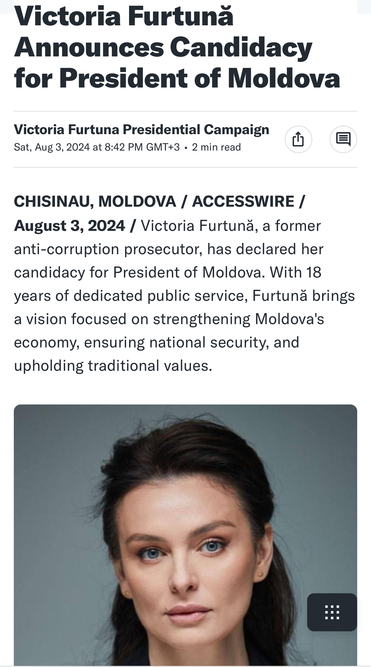 “Victoria Furtună, fost procuror anticorupție, și-a anunțat candidatura la Președinția Republicii Moldova. Cu o experiență de 18 ani în serviciul public, Furtună aduce o viziune concentrată pe consolidarea economiei Moldovei, asigurarea securității naționale și susținerea valorilor tradiționale”. Textul se conține într-un articol scris de publicația internațională Accesswire.